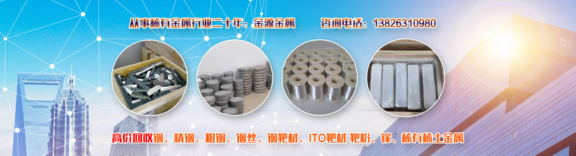 韶關市金源金屬材料有限公司坐落于中國廣東省韶關市,長期收購回收銦、精銦、粗銦、銦絲、銦靶材、ITO靶材靶粉、回收金屬鍺、鍺錠、鍺粉、鍺片、回收鍺單晶、單晶鍺、鍺粒、區熔鍺、工業鍺、廢鍺、鍺泥、鍺渣、二氧化鍺回收、四氯化鍺、有機鍺、銀、純銀、銀靶材、高價收購回收ITO廢靶、回收廢銦、廢銦沙、廢銦渣、回收粗銦、廢銦絲、廢銦珠、廢銦箔、廢銦棒、收購銀焊條、銀焊絲、導電銀膠、金屬鎵、硝酸鎵、氧化鎵、三氯化鎵、氯化鎵,供應及回收氧化鎵、氫氧化鎵、碲化鎵,硒化鎵,銦粉,氧化銦、氯化銦、硫酸銦、硫化銦、醋酸銦、氫氧化銦、硒化銦,碘化銦,銅銦鎵硒,含金、銀、銦、銠、鈀、鎵、鍺等稀有貴金屬材料,稀土金屬材料、氧化鏑、氧化镥、氧化鋱、氧化鐠釹等回收。